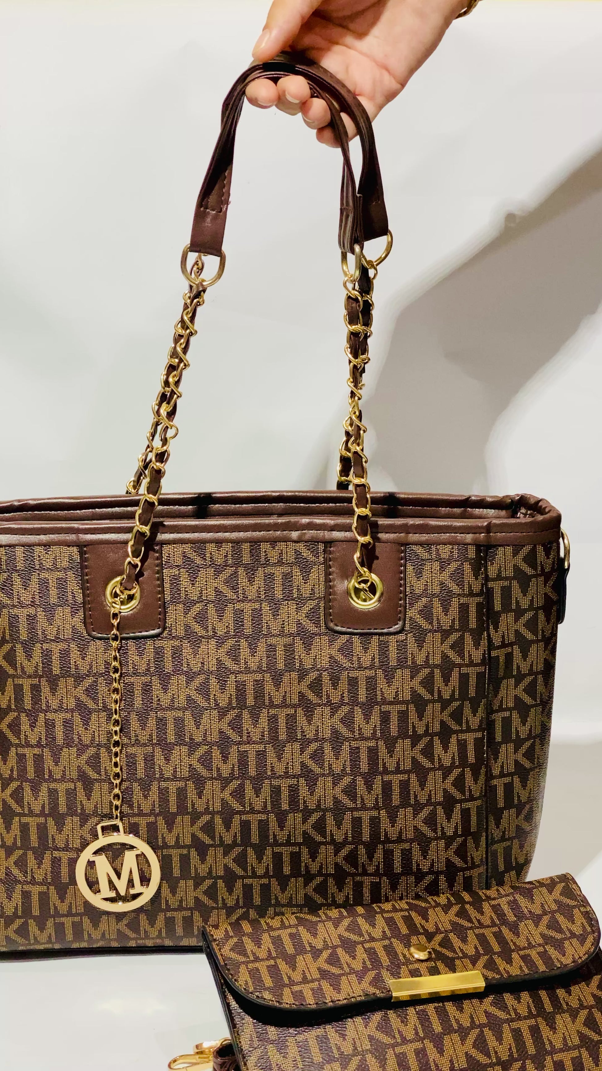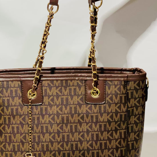 Upgrade your style with this bold MK monogram handbag featuring a premium finish and gold-tone chain details. Spacious, elegant, and practical, it includes a matching wallet — perfect for work, shopping, travel, or daily use.